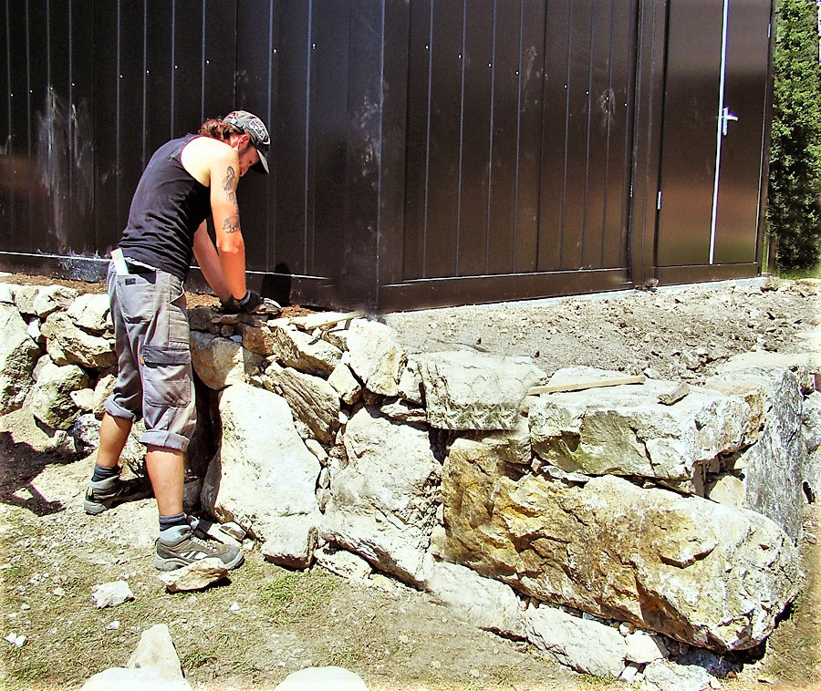Die dafür benötigten Steine haben teilweise ein Gewicht von über 1000 kg und konnten nur mit Hilfe von Hebelstangen bewegt werden. Zum Transport verwendeten wir eine einfache Holzplatte, auf der wir die Steine mittels Seil über Rollen aus Holz gezogen haben. Die Trockensteinmauer unseres keltischen Hauses misst an der Hangseite etwa 20 cm, an der Talseite musste sie jedoch auf eine Höhe von 80cm aufgebaut werden. Hier liegen besonders massive Steinblöcke unter etwas kleineren Steinen.
